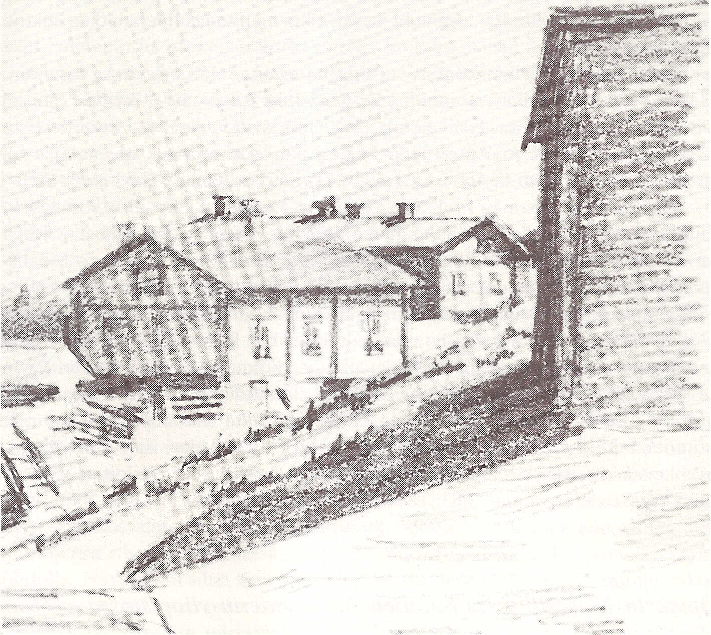 Työväen asuntoja Pellavatehtaan mäellä, lyijykynäpiirros v:lta 1888.