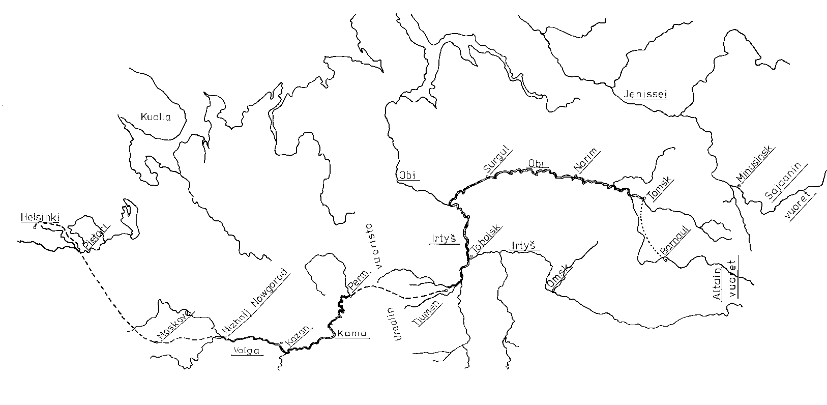 Kuva 2. R. Aspelinin ja Kaarlo Vuoren matka alkoi 13.6.1888 Helsingistä. Junalla matkustettiin Pietarin ja Moskovan kautta Nishnij Novgorodiin (18.6.) ja sieltä jatkettiin matkaa laivalla Volga- ja Kamajokia pitkin Permiin. Permistä (21.6.) junalla Uralin yli Tjumeniin. Tjumenista (24.6.) matka jatkui laivalla aina Tomskiin. Tomskista Minusinskiin (vrt. toinen kartta) kuljettiin Sajaanin vuorten kautta hevosilla, ratsain ja lautoilla. Paluu Minusinskistä Tomskiin ja edelleen Tjumeniin (21.11.) tehtiin talviolosuhteissa rekikyydillä ja Tjumenista eteenpäin junalla ja laivalla samoja reittejä kuin oli tultukin. Helsingissä oltiin 31.10.