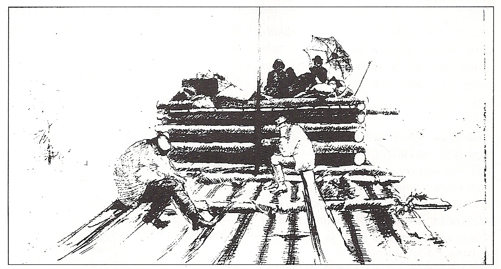 ”Aamulla aikaisin kun tee oli juotu, ruvettiin sitomaan kaikki liikkuva tavara niin lujasti lauttaan kiinni nuorilla ja puilla kun voitiin ja sitten ihmiset tavaroiden päälle istumaan ja pitämään kiinni nuorista. Näin varustettuna odotettiin sitä suurta koskea. Ja se tuli: ei se niin pitkä ollutkaan, mutta hyppäsi siinä vesi aika tavalla, löi sinne ylös saakka, vaikkei minun puolellani,joten pääsimme aivan kuivina. Sitten tuli taas uusia koskia, jotka olivat lauhkeampia ja pitempiä. Sellainen oli sitten minun ensimmäinen koskenlaskuni. Sukkelaan tämä Jenissei virtaakin, sillä