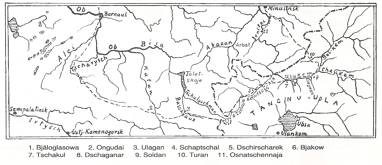 Kuva 8. Matkareitti tutkimusalueella Altain vuoristossa ja Sajaanin vuorilla. (Hj. Appelgren-Kivalo, Alt-altaische Kunstdenkmäler.)